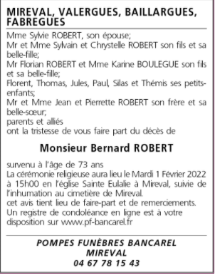 Décédé à Mireval (34110, France) le jeudi 27 janvier 2022 à l'âge de 73 ans